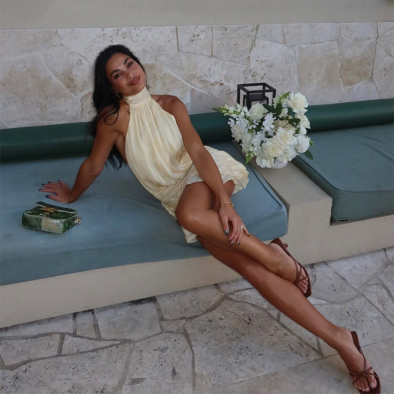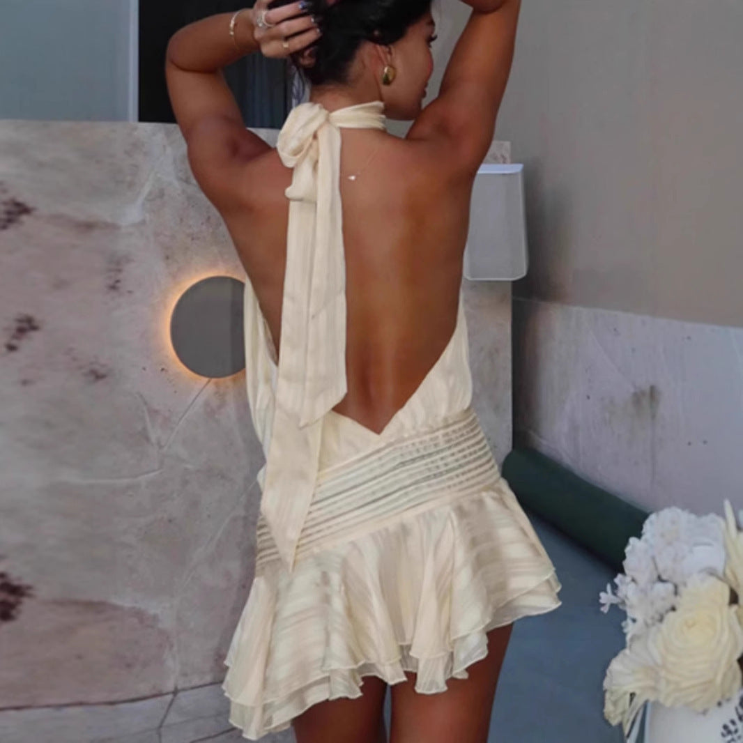 Koronkowy fason z wiązaniem na plecach w kroju mini. Można uzupełnić prostymi sandałami. Może pasować na przyjęcia w ciepłe dni.